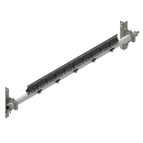 TUFF R Spray Secondary Belt Cleaners deliver effective long term cleaning with minimal maintenance. Independent shock absorbing cushions provide constant tensioning to the high grade tungsten tips that will individually self-adjust to irregular contours of belt surfaces. Poles have incorporated spray jets allowing the introduction of water to help dislodge carry back fines embedded into the belt's surface and to lubricate cleaner tips or blades. Significant increases in cleaner performance and life will be delivered when water sprays are utilised. Spray jets are angled at 45 degrees to the belt for a high pressure, low volume spray. It is recommended that a TUFF Water Control Board be utilised for optimum control and filtration. Also available in Reinforced Spray Pole and Custom Built models. A range of cushions, tips and spray jet sizes are available for different applications including vulcanised and mechanical spliced belts. Suitable for Reversing Belts in underground, hard rock and metal mining, aggregate, bulk material handling, and wood products operations. Maximum Belt Speed - 6 m/sec. Water consumption 19.5 ltr/m @ 3 bar with Size 10 Jets