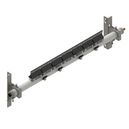 TUFF R Spray Secondary Belt Cleaners deliver effective long term cleaning with minimal maintenance. Independent shock absorbing cushions provide constant tensioning to the high grade tungsten tips that will individually self-adjust to irregular contours of belt surfaces. Poles have incorporated spray jets allowing the introduction of water to help dislodge carry back fines embedded into the belt's surface and to lubricate cleaner tips or blades. Significant increases in cleaner performance and life will be delivered when water sprays are utilised. Spray jets are angled at 45 degrees to the belt for a high pressure, low volume spray. It is recommended that a TUFF Water Control Board be utilised for optimum control and filtration. Also available in Reinforced Spray Pole and Custom Built models. A range of cushions, tips and spray jet sizes are available for different applications including vulcanised and mechanical spliced belts. Suitable for Reversing Belts in underground, hard rock and metal mining, aggregate, bulk material handling, and wood products operations. Maximum Belt Speed - 6 m/sec. Water consumption 15.6 ltr/m @ 3 bar with Size 10 Jets